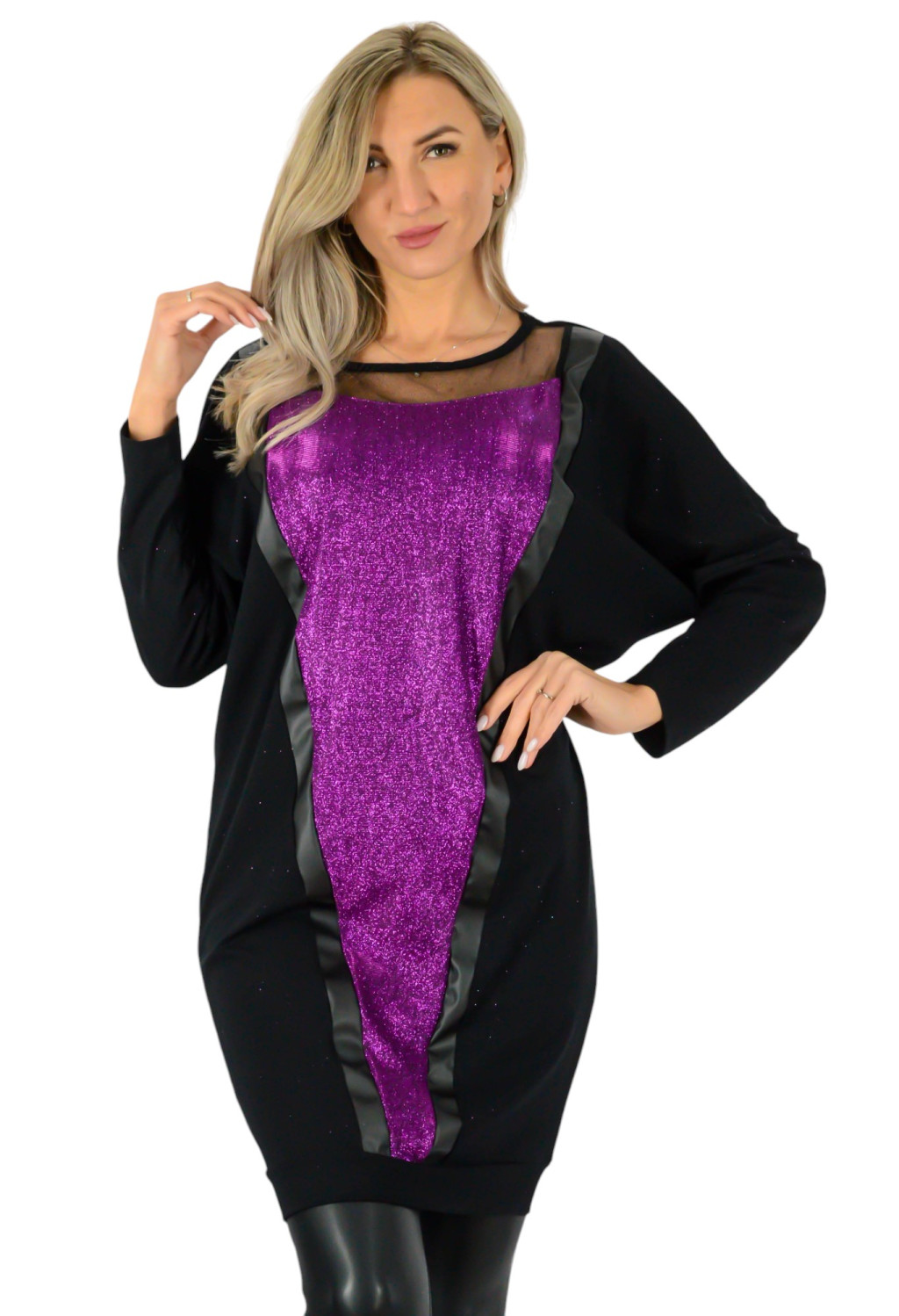Bőrrel és tüllel kombinált, csillámló pamut ruha – Lila Kényelmes pamut ruha csillámos betéttel, fekete bőrhatású díszítéssel és finom tüll részlettel. Laza, mégis látványos fazon – tökéletes alkalmakra és vagány hétköznapokra. Anyaga puha, kényelmes és rugalmas. Anyagösszetétel: 67% pamut, 33% viszkóz.