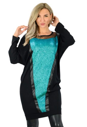 Bőrrel és tüllel kombinált, csillámló pamut ruha – Türkiz Kényelmes pamut ruha csillámos betéttel, fekete bőrhatású díszítéssel és finom tüll részlettel. Laza, mégis látványos fazon – tökéletes alkalmakra és vagány hétköznapokra. Anyaga puha, kényelmes és rugalmas. Anyagösszetétel: 67% pamut, 33% viszkóz.