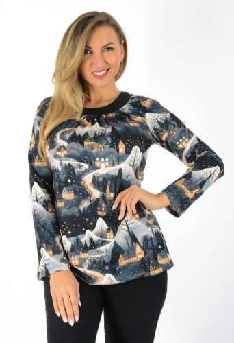 Hátul nyakban megkötős, gumis aljú felső – Grafitszürke/téli táj mintás Kényelmes, hátul nyakban megkötős, gumis aljú hosszú ujjú női felső. Tökéletes választás hétköznapra, karácsonyi programokra és bulikra is. Anyaga puha, kényelmes és rugalmas. Anyagösszetétel: 70% pamut, 30% elasztán.