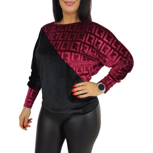 Kerek nyakkivágású, laza denevér ujjú, passzés aljú és passzés ujjvégű női felső, amely egyszerre elegáns és divatos. Anyaga puha, rugalmas plüss bársony, enyhén fényes felülettel és exkluzív mintázattal.Anyagösszetétel: 95% polyester, 5% elasztán.Megjegyzés: A termék színtelítettségében, árnyalatában lehet eltérés a stúdióban vagy a szabadban "használt" fényviszonyoknak köszönhetően, illetve az okos eszközök kijelzőjének különböző szín - és fényerő beállításai miatt.Szállítás 1-2 munkanap!Mosási javaslat:30°C-on, kifordítva, kímélő programon mosható.Ne fehérítsd, optikai fehérítőt ne használj.Színfogó kendő használata ajánlott.