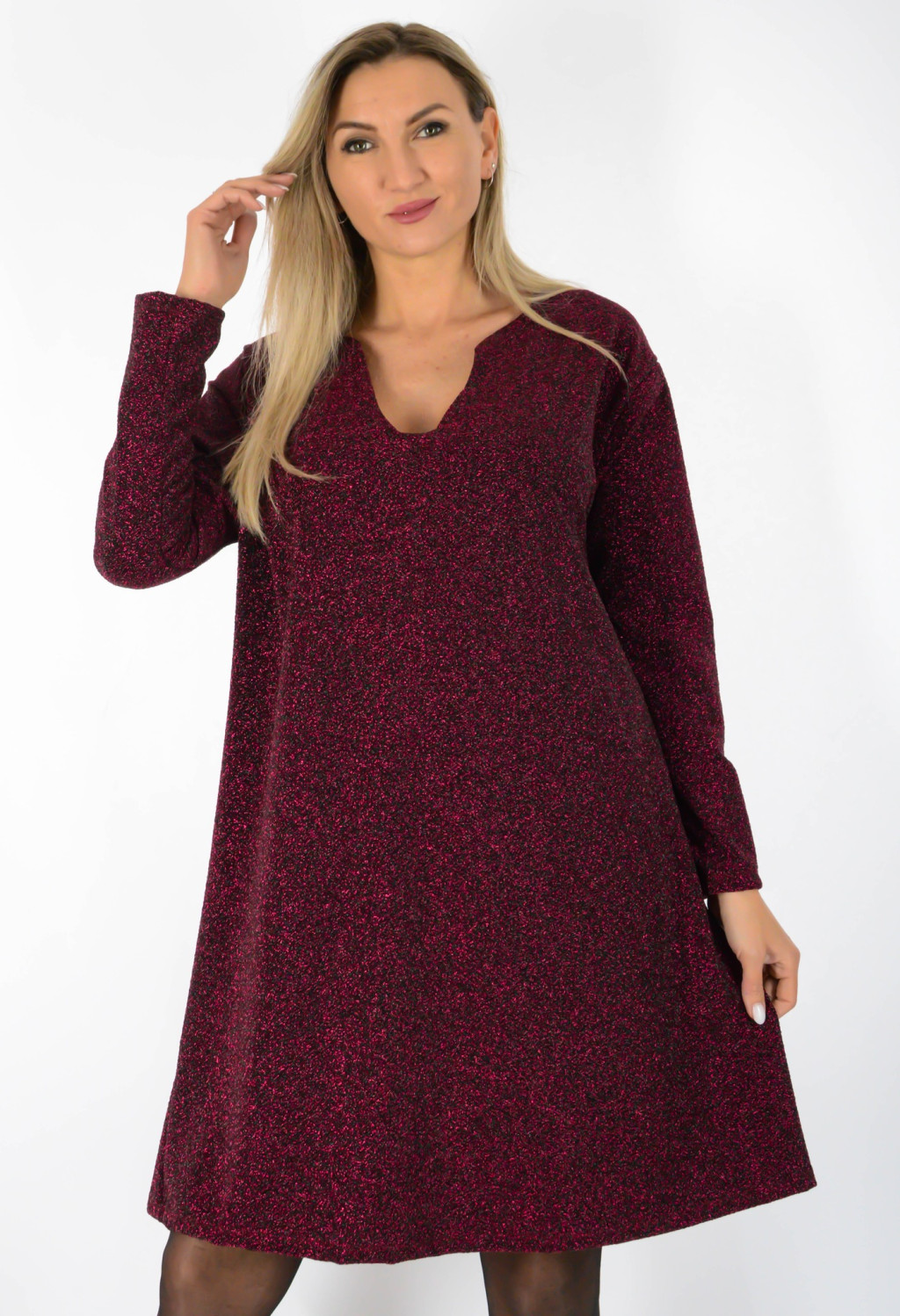 Finoman csillogó lurex anyagú, plus size ruha ívelt nyakkivágással és laza, A-vonalú szabással. Kényelmes, rugalmas anyaga szépen követi az alakot, miközben elegáns megjelenést ad. Ideális választás ünnepi alkalmakra, vacsorákra vagy akár stílusos hétköznapokra.