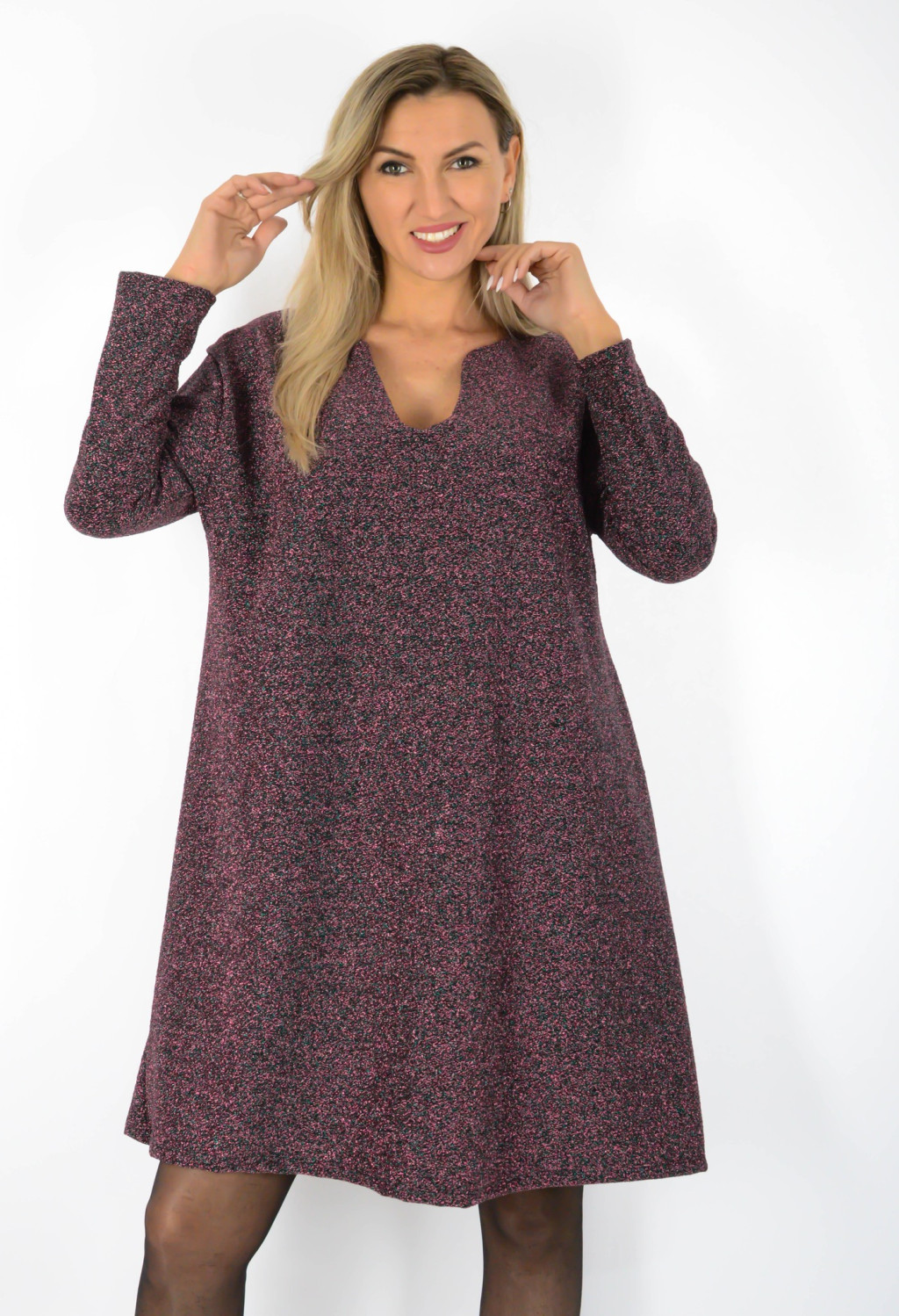 Finoman csillogó lurex anyagú, plus size ruha ívelt nyakkivágással és laza, A-vonalú szabással. Kényelmes, rugalmas anyaga szépen követi az alakot, miközben elegáns megjelenést ad. Ideális választás ünnepi alkalmakra, vacsorákra vagy akár stílusos hétköznapokra.