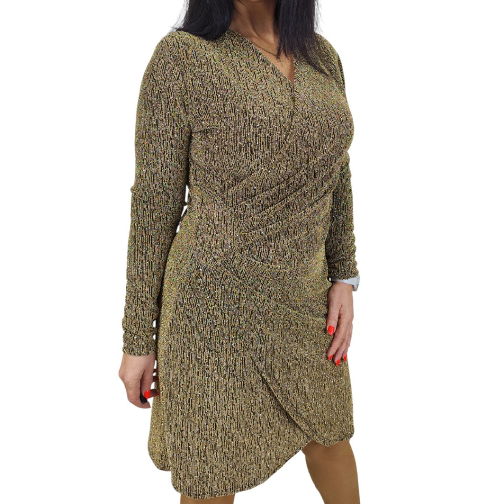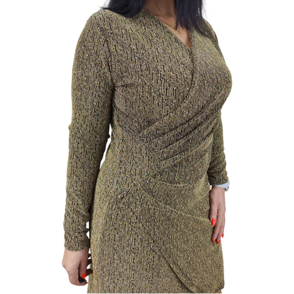 Elegáns V-nyakú, mellrésztől derékig átlapolt, oldalán finoman összehúzott díszítéssel kialakított, piros csillogó szálakkal átszőtt hosszú ujjú alkalmi ruha. Elegáns, nőies fazon, amely tökéletes választás ünnepi alkalmakra és különleges eseményekre. Anyaga rugalmas és kényelmes, szépen követi az alakot.Anyagösszetétel: 70% nylon, 25% lurex, 5% spandex.Megjegyzés: A termék színtelítettségében, árnyalatában lehet eltérés a stúdióban vagy a szabadban "használt" fényviszonyoknak köszönhetően, illetve az okos eszközök kijelzőjének különböző szín - és fényerő beállításai miatt.Szállítás 1-2 munkanap!Mosási javaslat:30°C-on, kifordítva, kímélő programon mosható.Ne fehérítsd, optikai fehérítőt ne használj.Színfogó kendő használata ajánlott.