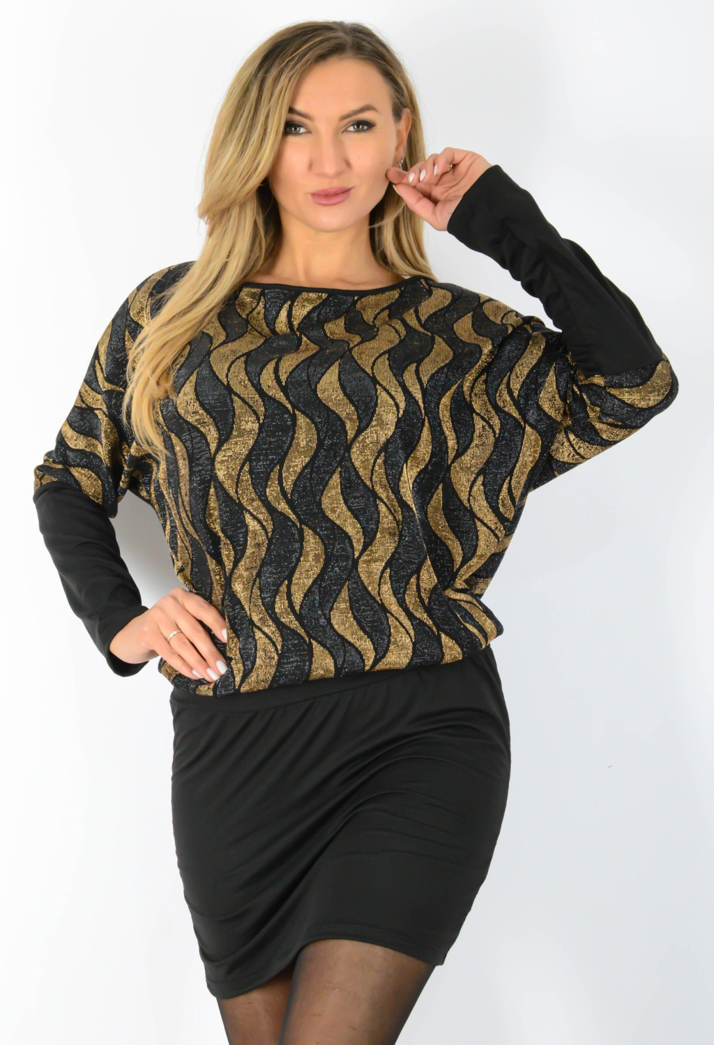 Elegáns, lurex csillogású denevérujjú ruha rugalmas, kényelmes anyagból. Könnyed esésű felsőrésszel és nőies, testhez simuló alsó résszel. Tökéletes választás alkalmakra, bulikra és az ünnepi szezonra.