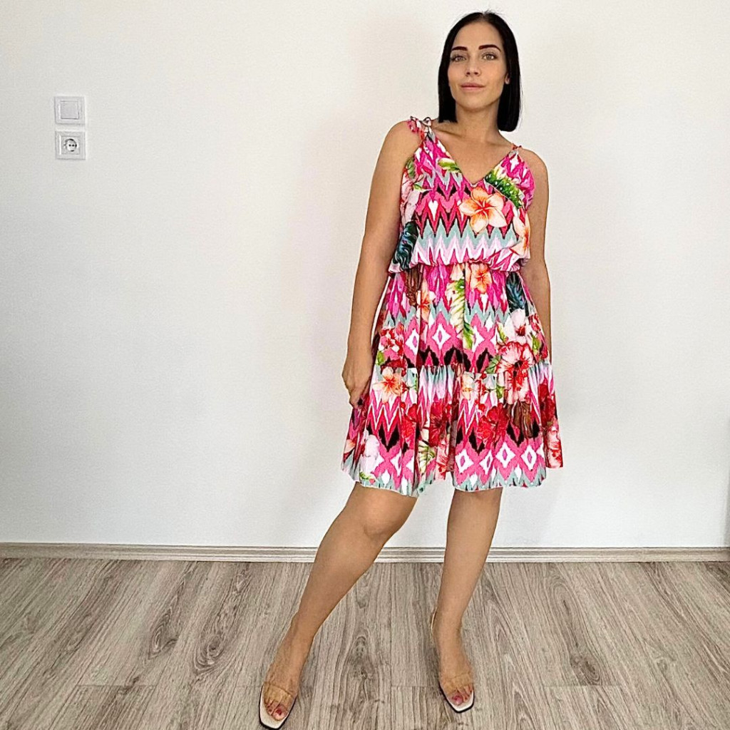 Sunny pántos V-nyakú midiruha - Rózsaszín virág mintás pántos, dísz megkőtéssel, elöl-hátul V-nyakú, derékban gumirozott, ejtett női midi ruha. Anyagösszetétel: 95% polyester, 5% elasztán.