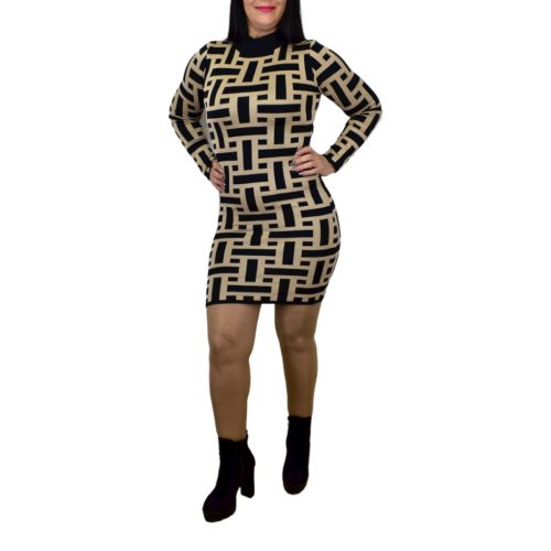 Leona fekete-bézs mintás női ruha magasított nyakú, testhezálló gépi kötött hosszú ujjú női ruha, amely elegánsan divatos viselet alkalmakra. Anyaga puha, kényelmes és rugalmas. Anyagösszetétel: 85% viscose, 15% nylon.Anyagából fakadóan kényelmesen és esztétikusan enged. Méreteket mindig ellenőrizd! A termék színtelítettségében, árnyalatában lehet eltérés a stúdióban vagy a szabadban "használt" fényviszonyoknak köszönhetően, illetve az okos eszközök kijelzőjének különböző szín - és fényerő beállításai miatt.