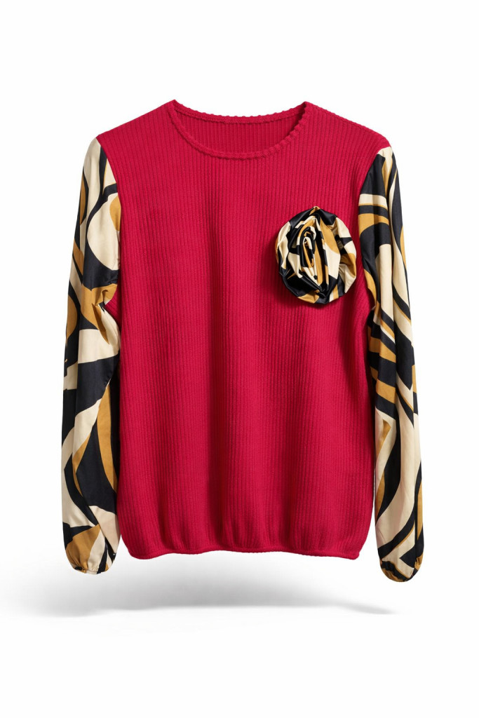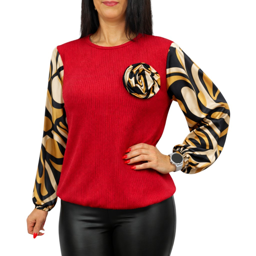 Kerek nyakú, virággal díszítve, ujjban színes melegselyem anyaggal, gumis aljú, rugalmas bordázott gépi kötött hosszú ujjú felső amely elegánsan divatos viselet alkalmakra. Anyaga puha, kényelmes és rugalmas.Anyagösszetétel: 48% viscosa, 29% poliestere, 19% nylon, 4% elastan.Megjegyzés: A termék színtelítettségében, árnyalatában lehet eltérés a stúdióban vagy a szabadban "használt" fényviszonyoknak köszönhetően, illetve az okos eszközök kijelzőjének különböző szín - és fényerő beállításai miatt.Szállítás 1-2 munkanap!Mosási javaslat:30°C-on, kifordítva, kímélő programon mosható.Ne fehérítsd, optikai fehérítőt ne használj.Színfogó kendő használata ajánlott.