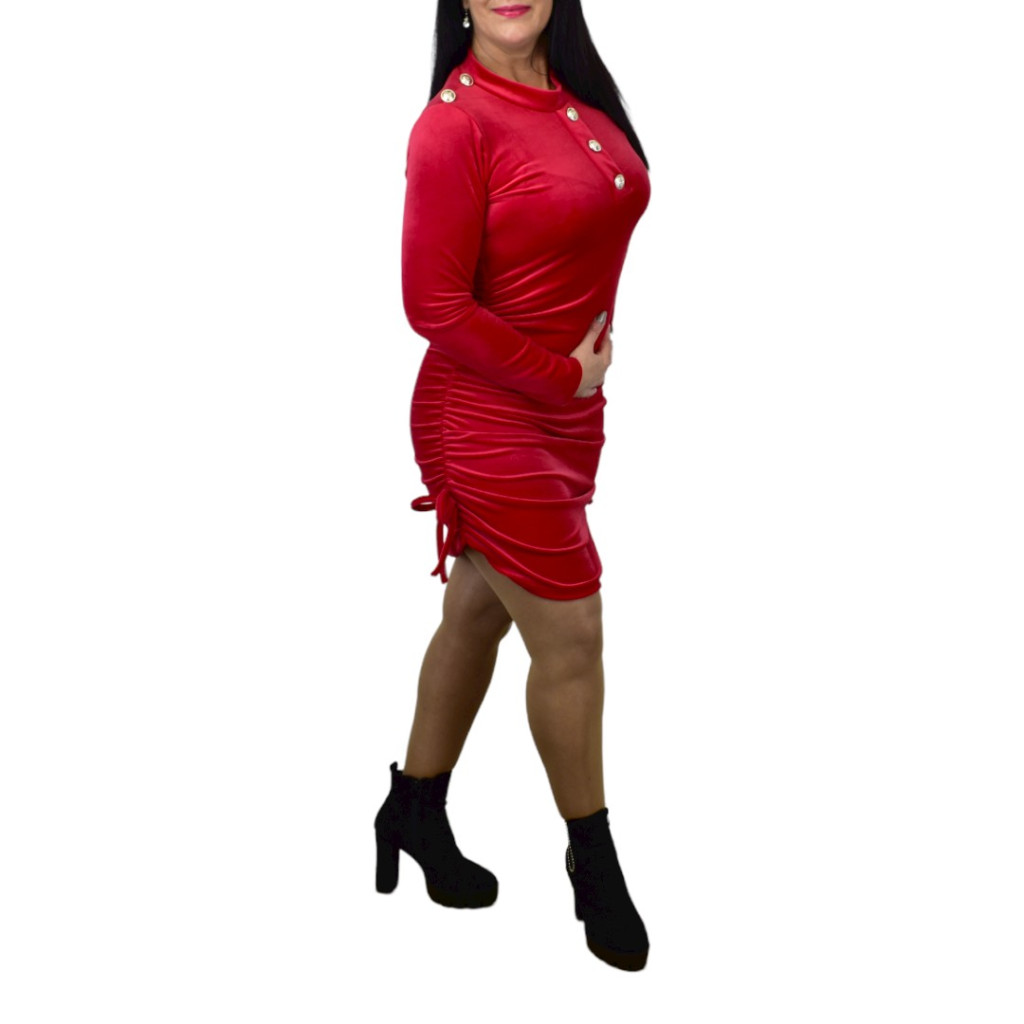 Neali díszgombos oldalt húzott plüss ruha – piros magasított nyakú, mellrésznél, vállrésznél díszgombos, kétoldalt összehúzott, megkötős, hosszú ujjú midi női ruha amely elegánsan divatos viselet alkalmakra. Anyaga puha plüss bársony, kényelmes és rugalmas. Anyagösszetétel: 95% viscose, 5% elastan.Anyagából fakadóan kényelmesen és esztétikusan enged. Méreteket mindig ellenőrizd! A termék színtelítettségében, árnyalatában lehet eltérés a stúdióban vagy a szabadban "használt" fényviszonyoknak köszönhetően, illetve az okos eszközök kijelzőjének különböző szín - és fényerő beállításai miatt.