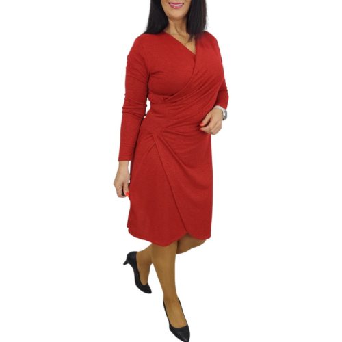 Elegáns V-nyakú, mellrésztől derékig átlapolt, oldalán finoman összehúzott díszítéssel kialakított, piros csillogó szálakkal átszőtt hosszú ujjú alkalmi ruha. Elegáns, nőies fazon, amely tökéletes választás ünnepi alkalmakra és különleges eseményekre. Anyaga rugalmas és kényelmes, szépen követi az alakot.Anyagösszetétel: 95% acryl, 5% elasztán.Megjegyzés: A termék színtelítettségében, árnyalatában lehet eltérés a stúdióban vagy a szabadban "használt" fényviszonyoknak köszönhetően, illetve az okos eszközök kijelzőjének különböző szín - és fényerő beállításai miatt.Szállítás 1-2 munkanap!Mosási javaslat:30°C-on, kifordítva, kímélő programon mosható.Ne fehérítsd, optikai fehérítőt ne használj.Színfogó kendő használata ajánlott.