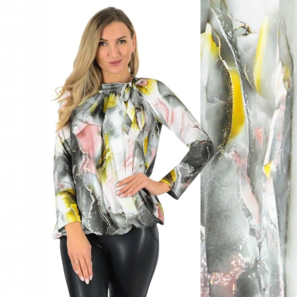 Arany nyomott mintás, nyakban megkötős, gumis aljú, hosszú ujjú női felső amely elegánsan divatos viselet alkalmakra. Anyaga puha, kényelmes és rugalmas. Anyagösszetétel: 67% pamut, 33% viszkóz.Megjegyzés: A termék színtelítettségében, árnyalatában lehet eltérés a stúdióban vagy a szabadban "használt" fényviszonyoknak köszönhetően, illetve az okos eszközök kijelzőjének különböző szín - és fényerő beállításai miatt.Szállítás 1-2 munkanap!Mosási javaslat:30°C-on, kifordítva, kímélő programon mosható.Ne fehérítsd, optikai fehérítőt ne használj.Színfogó kendő használata ajánlott.