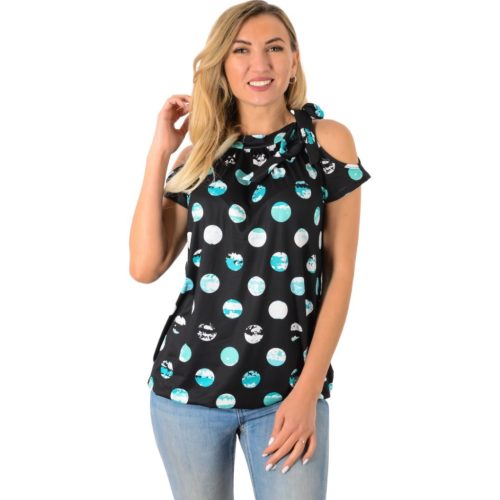 • Nyitott vállú, nőies kialakítás• Rövidujjú, könnyed viselet• Gumis aljú fazon, kényelmes illeszkedés• Laza szabás, nem tapad• Puha, jól szellőző anyag• Fekete-türkiz pöttyös minta