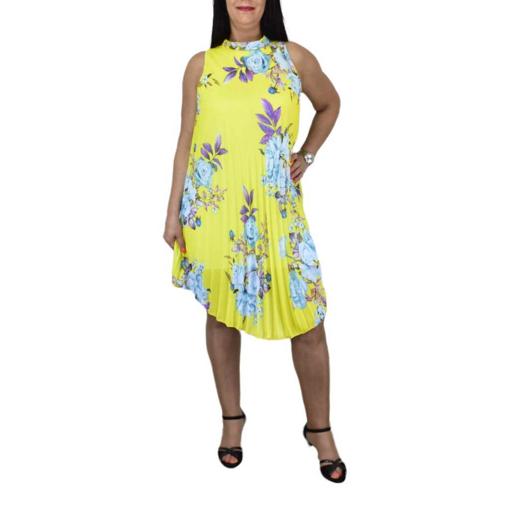 Flory ujjatlan pliszírozott ruha – Sárga virágmintás Ujjatlan, galléros nyakrésszel kialakított pliszírozott ruha, amely hátul a nyaknál gombbal záródik. A- vonalú, aszimmetrikus, dupla anyagú, mégis jól légáteresztő, így tökéletes választás melegebb napokra is.Kényelmes, nőies és elegáns viselet tavaszi–nyári alkalmakra. Anyagösszetétel: 100% poliészter. Alsórész: 95% viszkóz, 5% elasztán.Anyagából fakadóan kényelmesen és esztétikusan enged. Méreteket mindig ellenőrizd! A termék színtelítettségében, árnyalatában lehet eltérés a stúdióban vagy a szabadban "használt" fényviszonyoknak köszönhetően, illetve az okoseszközök kijelzőjének különböző szín - és fényerő beállításai miatt.