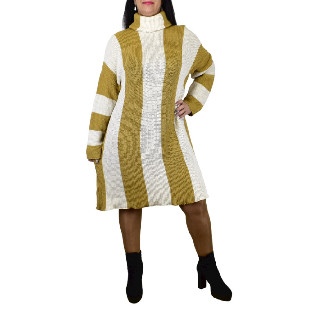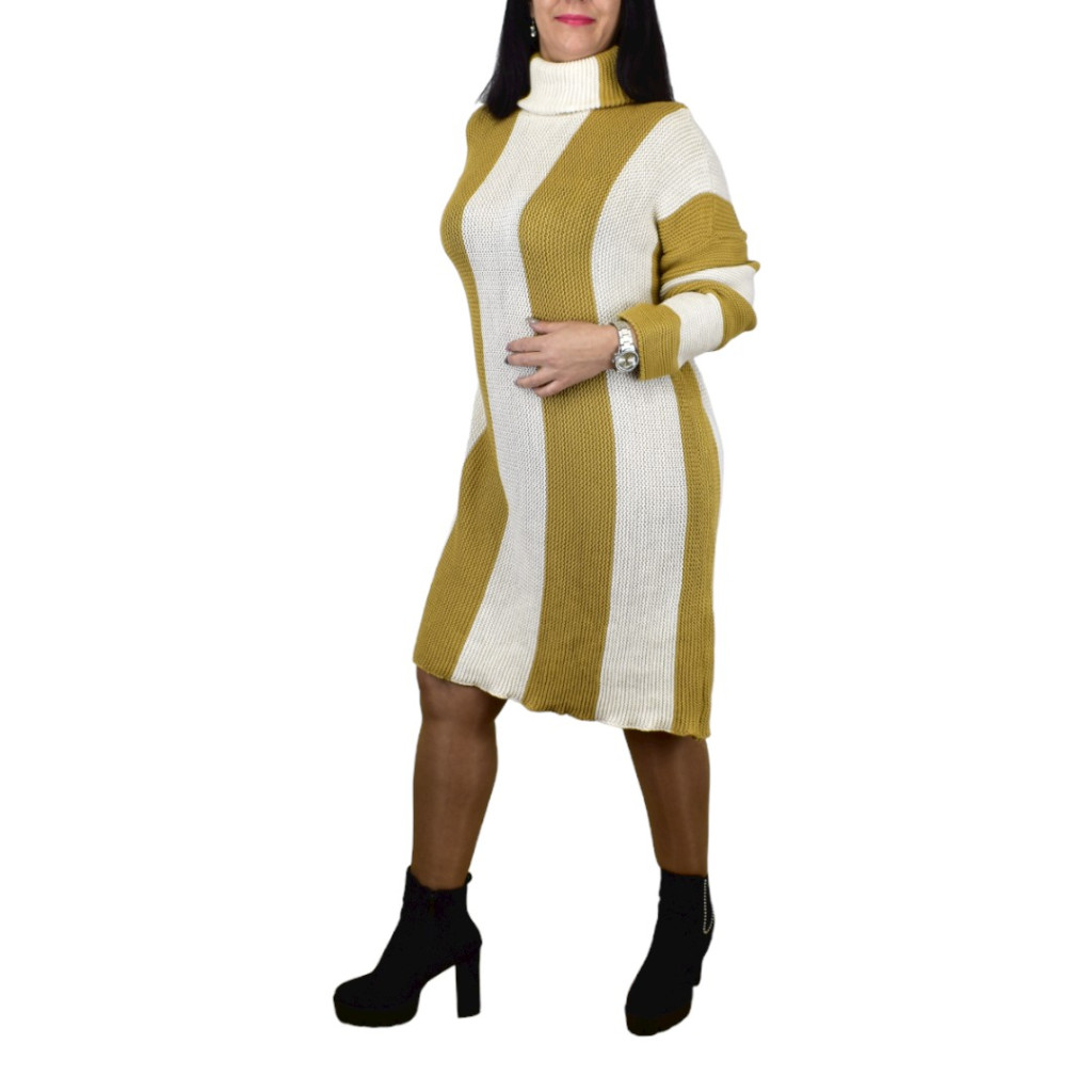 Magasított nyakú, gépikötött, hosszú ujjú női tunika. Puha tapintású, meleg kötött anyagból készült garbós ruha. A függőleges csíkozás optikailag karcsúsít, a lezser fazon pedig kényelmes viselet a hűvösebb napokon. Anyagösszetétel: 48% viscosa, 29% poliestere, 19% nylon, 4% elastan.
