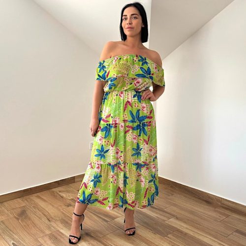 Simona vállrahúzható nyári mintás ruha - Limevirág gumírozott vállrahúzható, ejtett anyaggal díszítve, derékban gumírozott maxi női ruha amely elegánsan divatos viselet alkalmakra. Anyaga muszlin. Anyagösszetétel: 100% polyester.